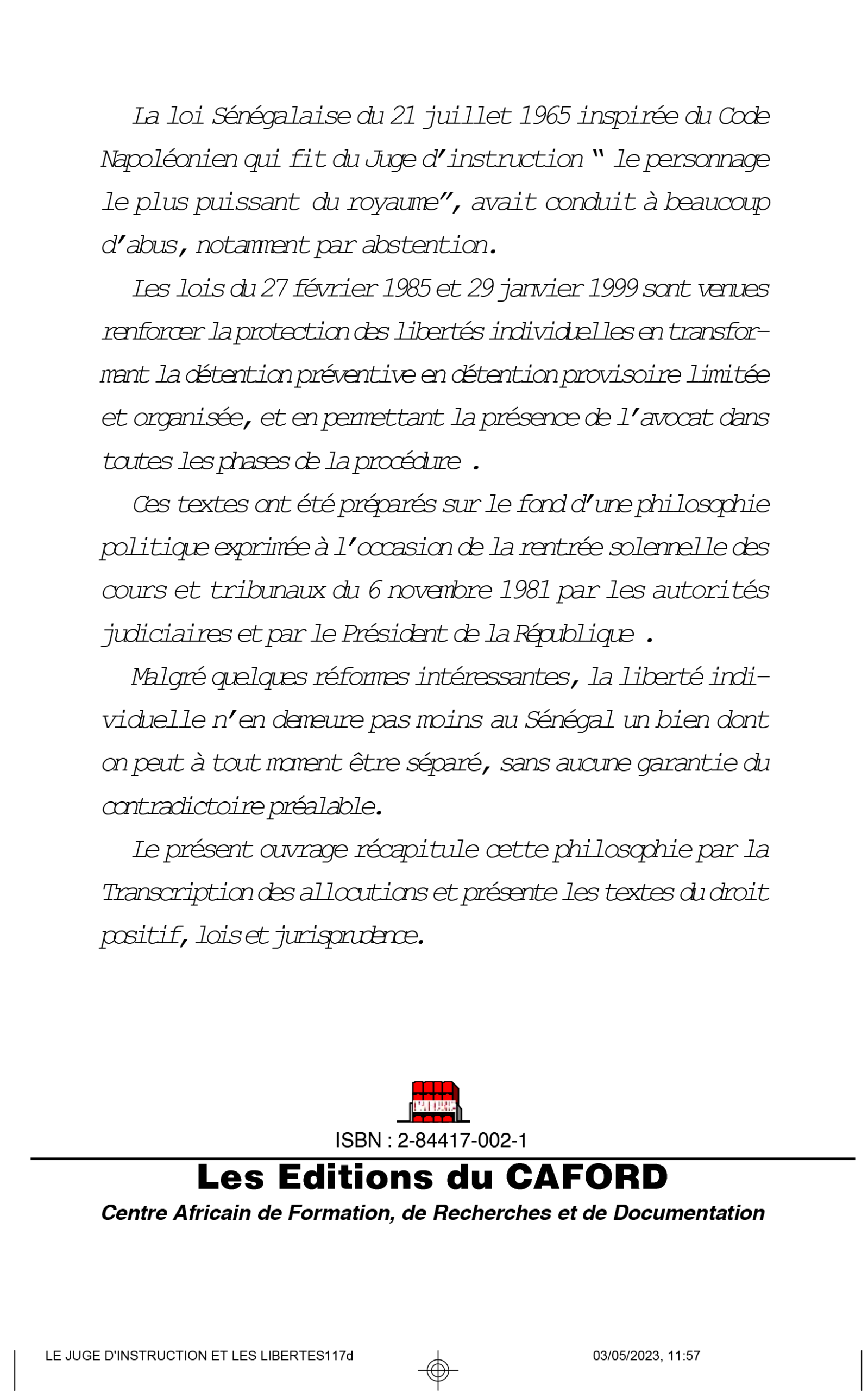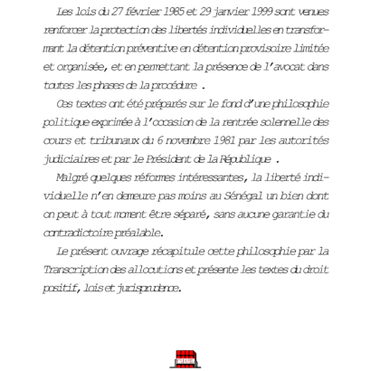 La loi Sénégalaise du 21 juillet 1965 inspirée du Code Napoléonien qui fit du Juge d’instruction “ le personnage le plus puissant du royaume”, avait conduit à beaucoup d’abus, notamment par abstention. Les lois du 27 février 1985 et 29 janvier 1999 sont venues renforcer la protection des libertés individuelles en transformant la détention préventive en détention provisoire limitée et organisée, et en permettant la présence de l’avocat dans toutes les phases de la procédure . Ces textes ont été préparés sur le fond d’une philosophie politique exprimée à l’occasion de la rentrée solennelle des cours et tribunaux du 6 novembre 1981 par les autorités judiciaires et par le Président de la République . Malgré quelques réformes intéressantes, la liberté individuelle n’en demeure pas moins au Sénégal un bien dont on peut à tout moment être séparé, sans aucune garantie du contradictoire préalable. Le présent ouvrage récapitule cette philosophie par la Transcription des allocutions et présente les textes du droit positif, lois et jurisprudence.